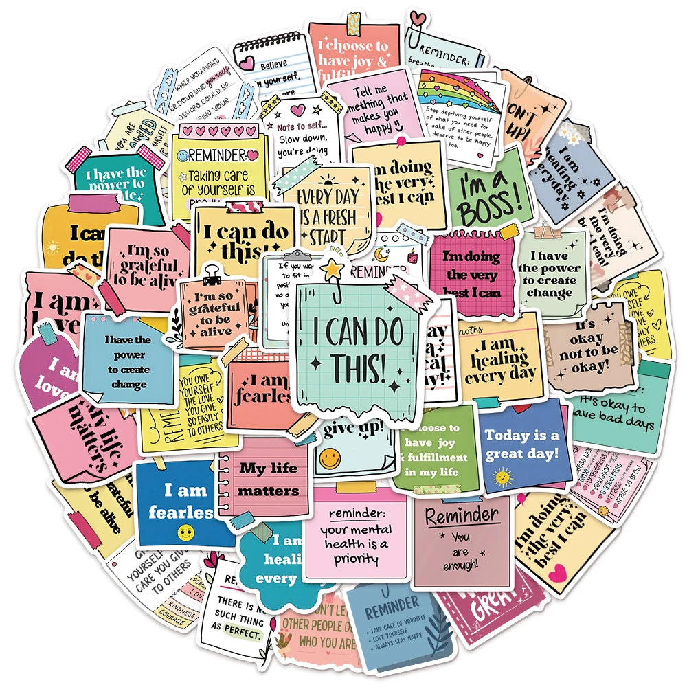 Inspire, uplift, and spread positivity with this 50-piece self-affirmation sticker set, featuring encouragement, self-love, and motivational quotes designed to support mental wellness.
