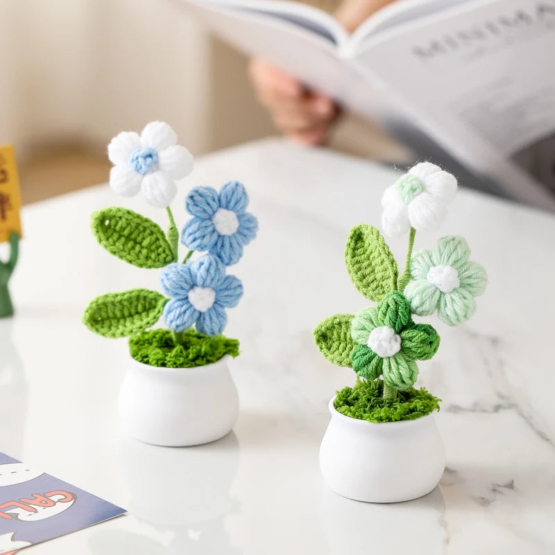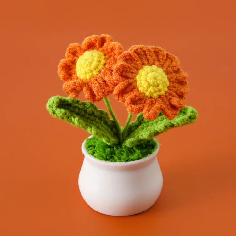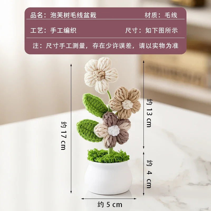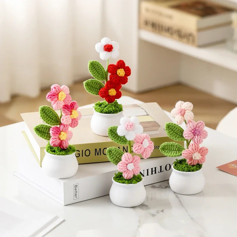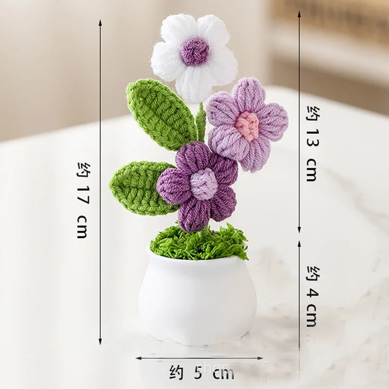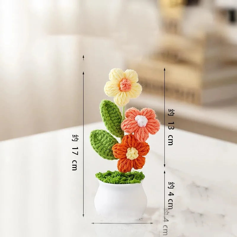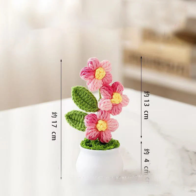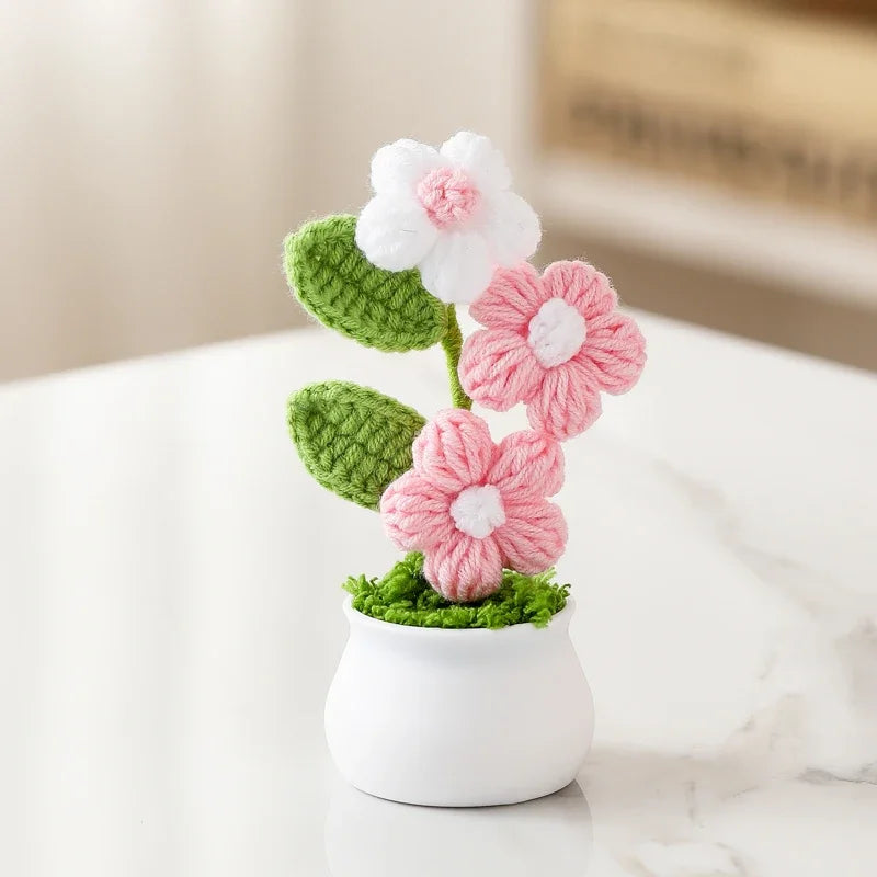 Crochet Knitted Artificial Flower Plant in Pot - Hand Woven Potted Desk Desktop Home Decor Gift Ornament