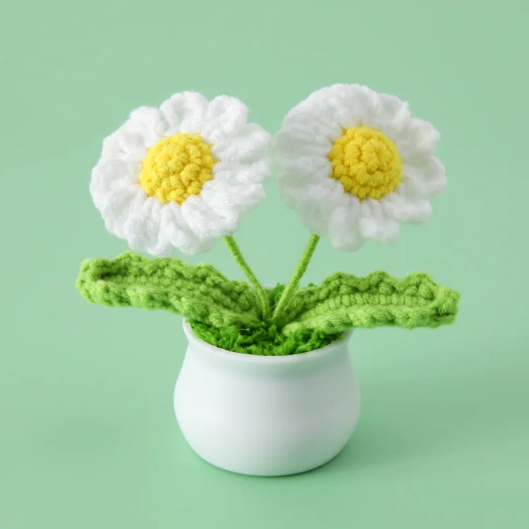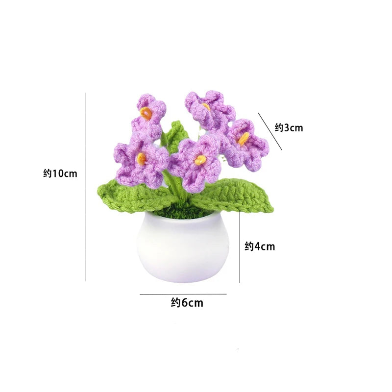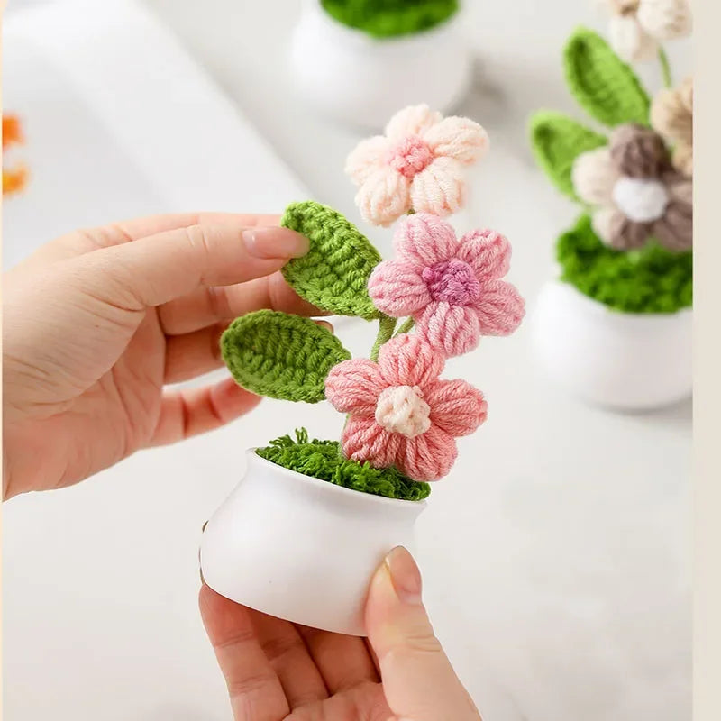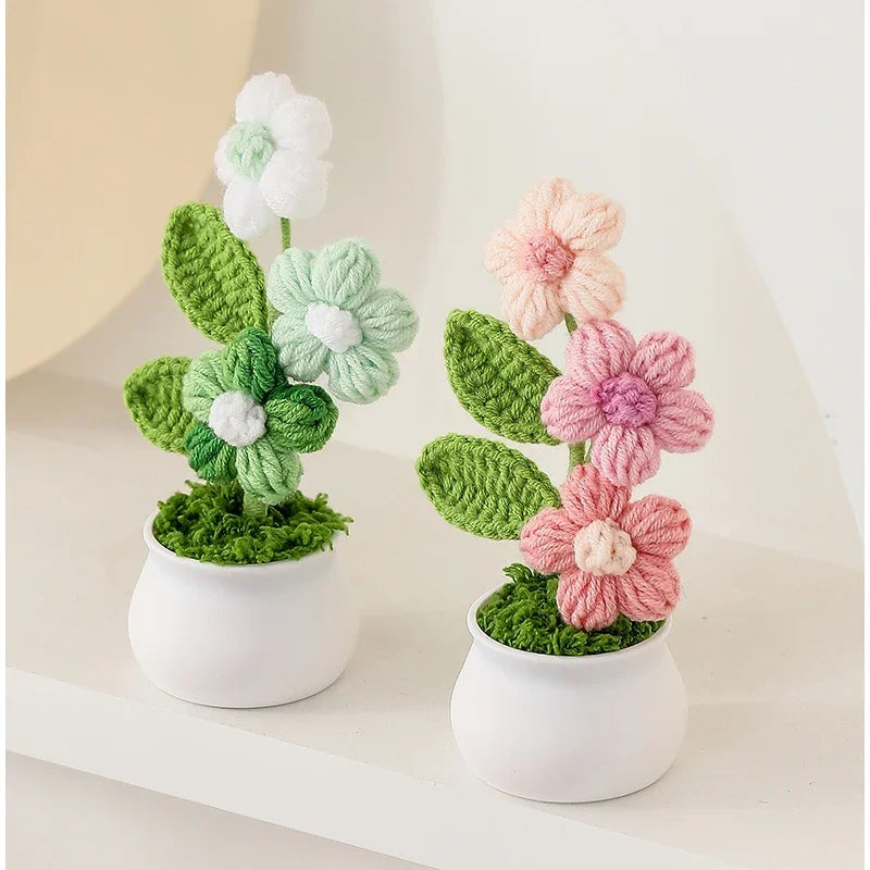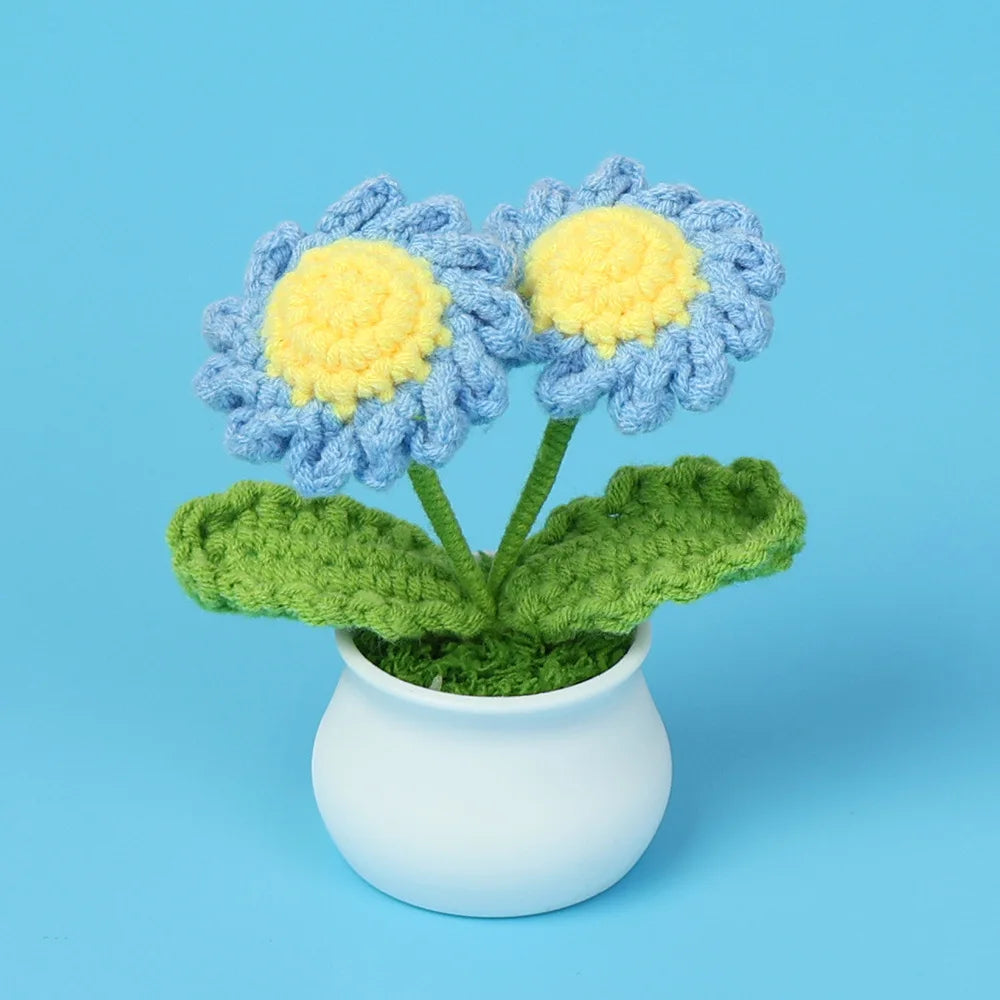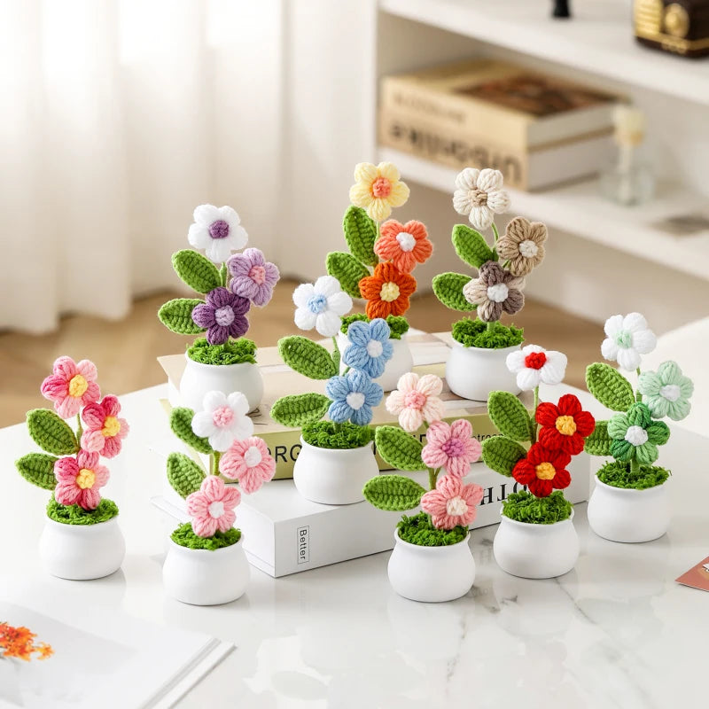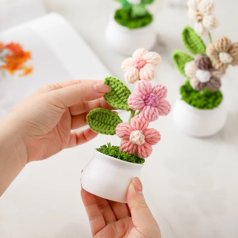 Crochet Knitted Artificial Flower Plant in Pot - Hand Woven Potted Desk Desktop Home Decor Gift Ornament