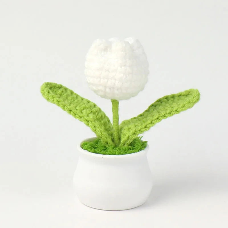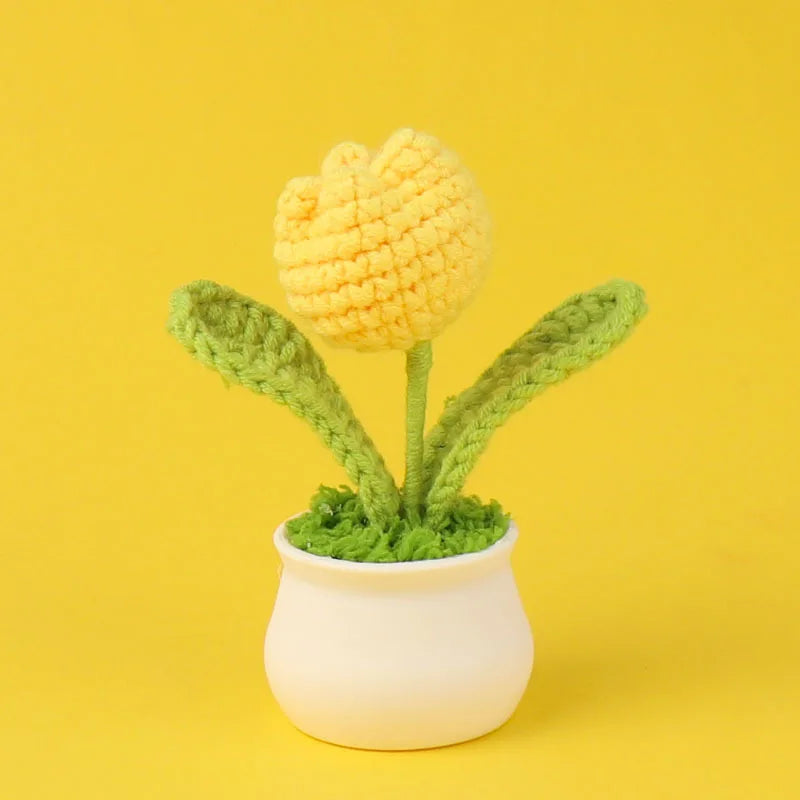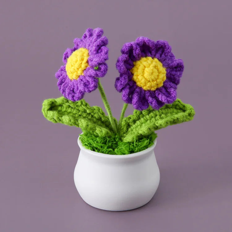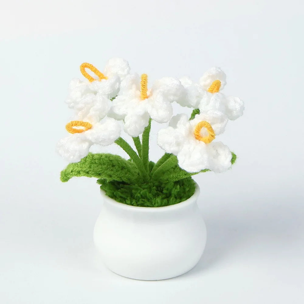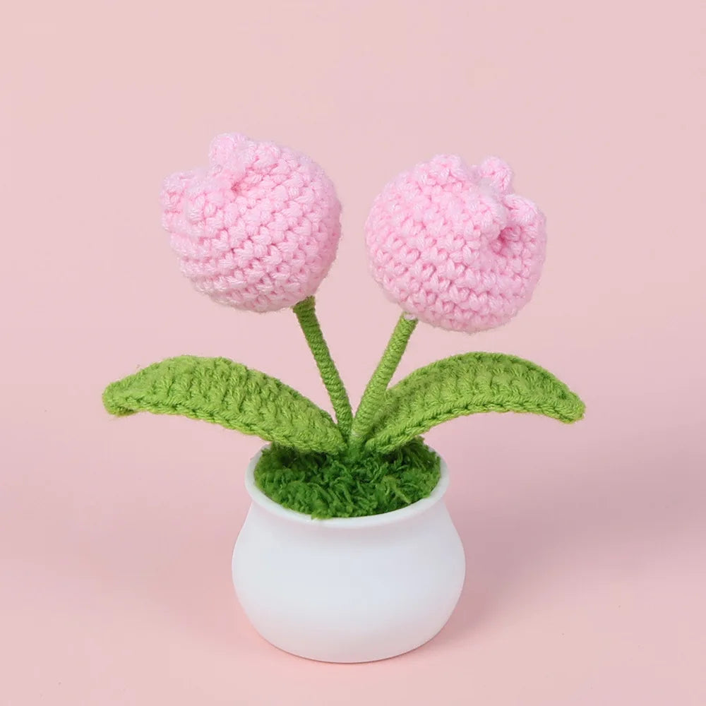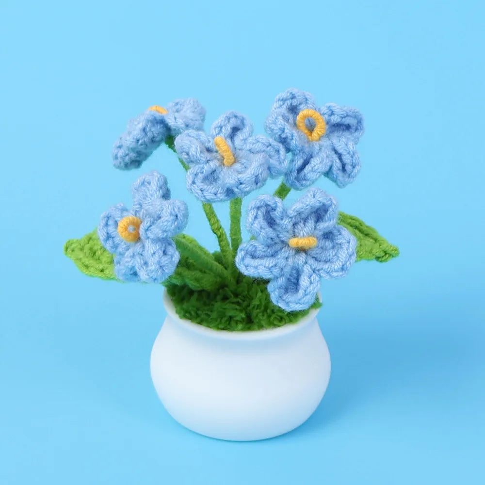 Crochet Knitted Artificial Flower Plant in Pot - Hand Woven Potted Desk Desktop Home Decor Gift Ornament