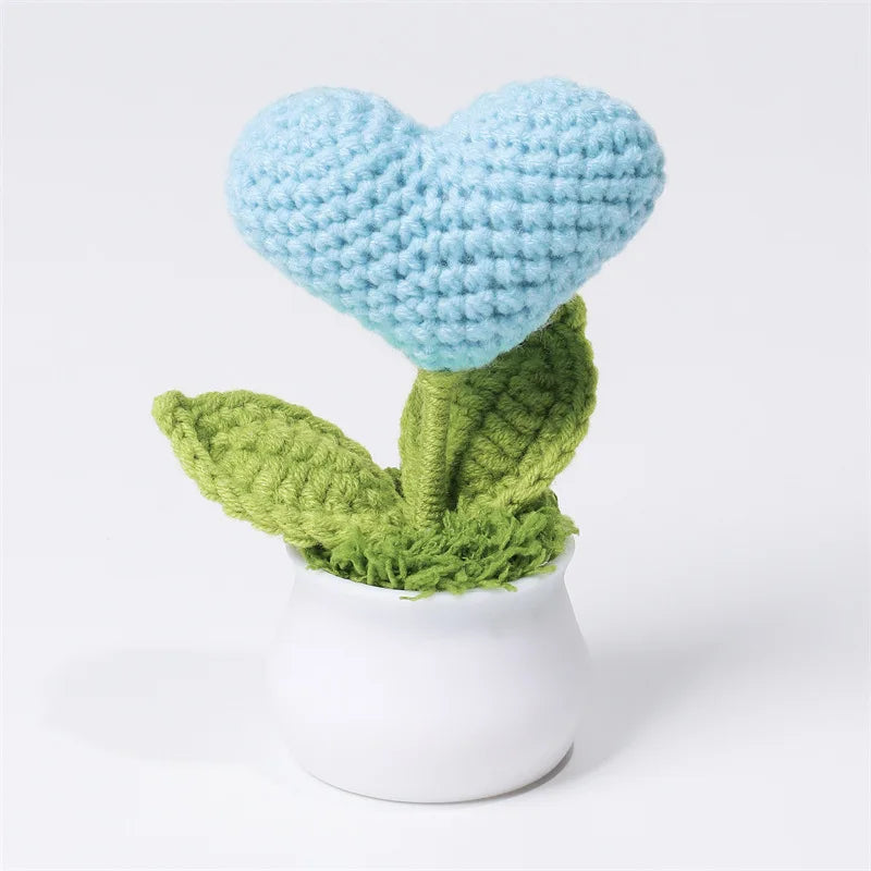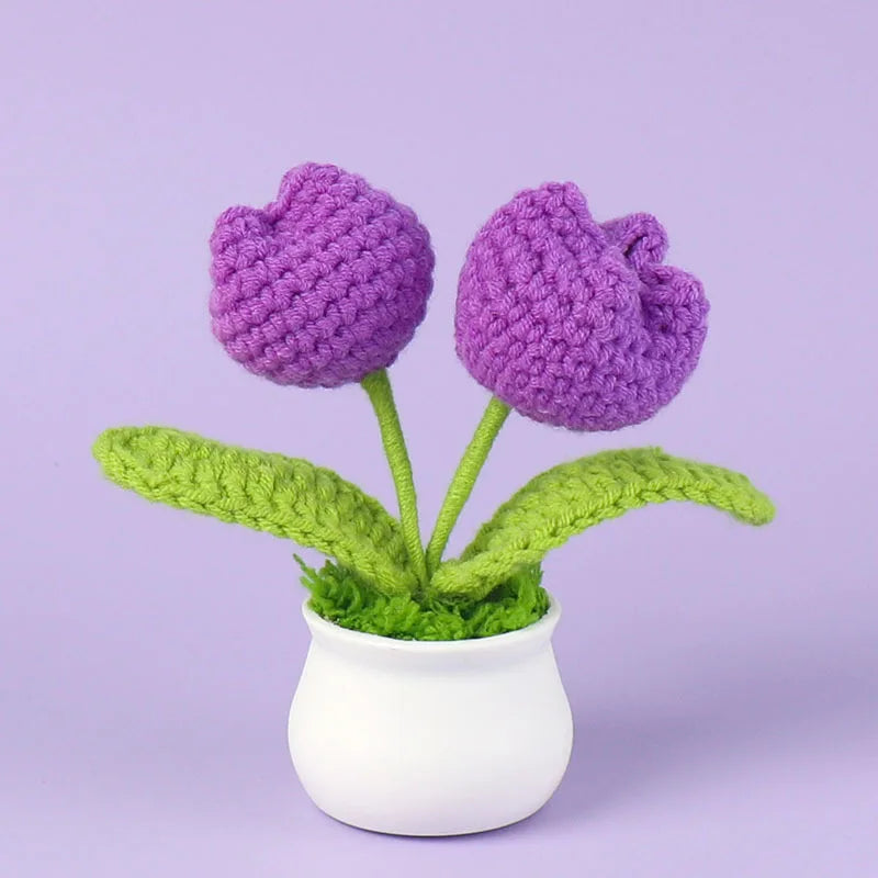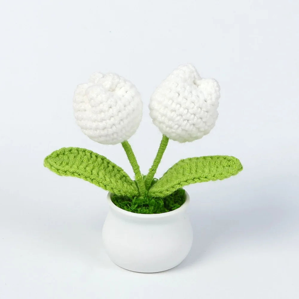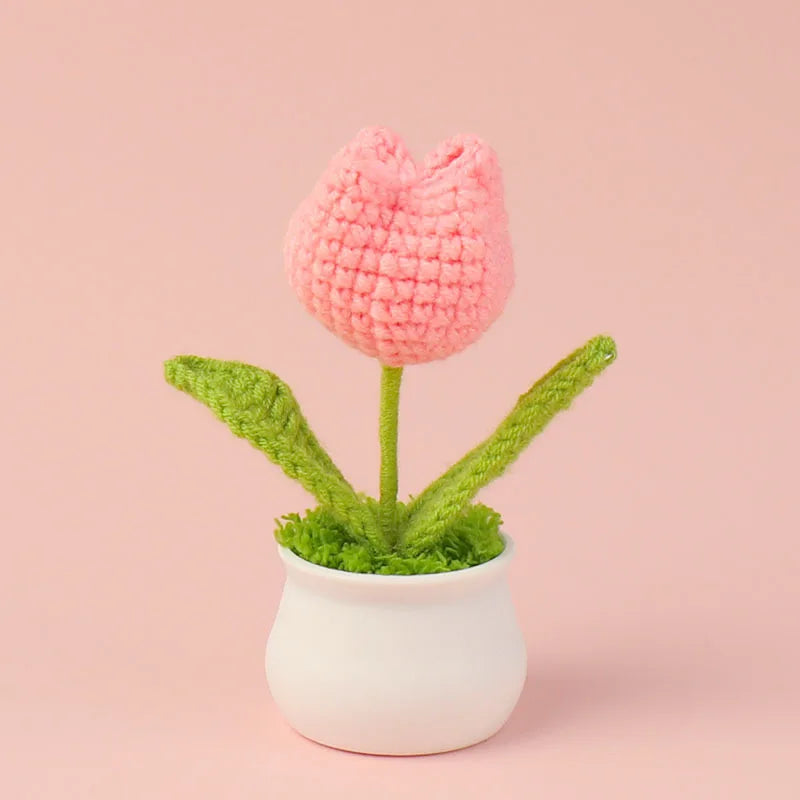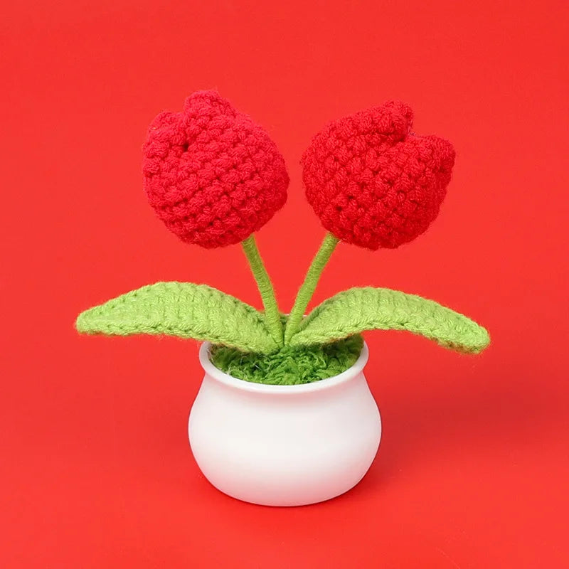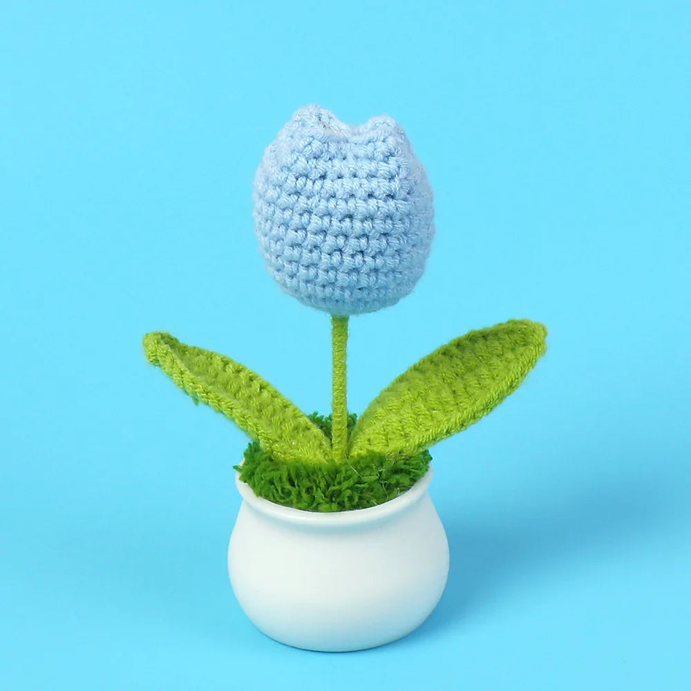 Crochet Knitted Artificial Flower Plant in Pot - Hand Woven Potted Desk Desktop Home Decor Gift Ornament